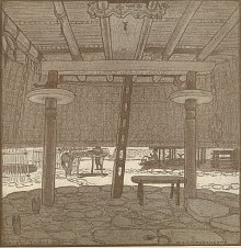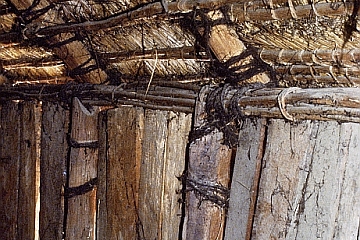 壁:軸組ができあがると、外周に沿って高さ1メートル程度の柱 ni ana (小柱といった意味) を立てならべる。この外周柱の上をぐるりと軒桁 nono (小屋組のモヤと同じ呼称) でつなぎ、屋根のタルキ suaf を受けるのである。同時に、軒桁にそって縦板を隙間なくならべて外周壁とする。