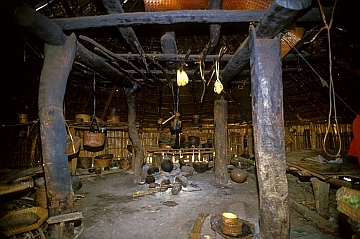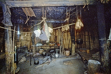 実際には、1メートルほどの高さの壁が周囲をめぐり、屋根組を支えるために、家のなかには4本柱の柱梁構造が組まれている。屋内の設備も土間の上に日常生活に最低限必要な物しか置かれていない。4本柱の中央に三つ石の炉 tunaf、柱によせて水甕 nai oel、奥の壁にそって調理道具や食器をならべる棚 tetu / pana があり、左右の壁際には寝所に使う低いベッド hala があるだけだ。