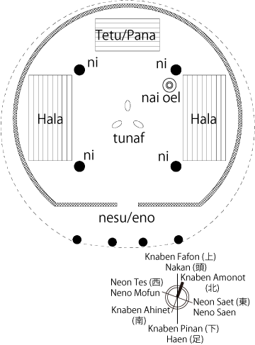 入口 nesu / eno は東 Neon Saet(Naon は太陽、Saet は昇る)を向くか、あるいは土間床の雨仕舞を考慮して、土地の低い側にとられることが多い。この場合、オーストロネシア語族の通例にしたがって、南北の方位のかわりに Fafon (上) / Pinan (下)、Nakaf (頭) / Haef (足) などの言葉で家の向きをあらわしている。入口は Pinan や Haef の側にあるわけだ。
