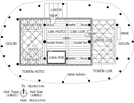 屋内は otan の前後でふたつの領域にわかれる。nulal lor のある手前側の Deu Mil Lor は家屋内でおこなうもろもろの儀礼の場で、葬儀の際には死者の遺骸をこの場所に横たえる。老人たちの寝所でもある。