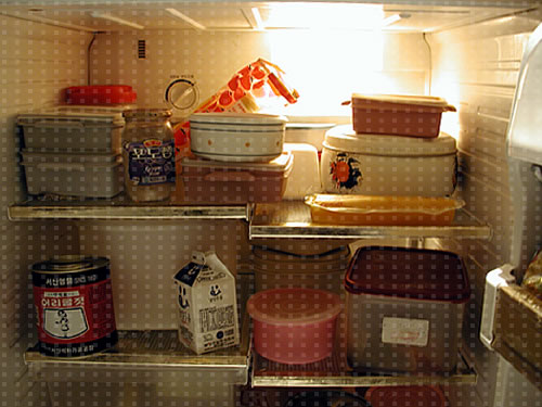 特別変わった物ではない。うちの家にもあるような白い、四角い冷蔵庫だ。それを開けて見るために、行列が出来ている。どうして? 何かスゴイ物が入っているの? 謎を解明するために私も並んでみた。いよいよ私の番。扉を開けて見えたのは……卵、牛乳、何かの食べ物が入った透明のプラスチック容器などなど。なんだ〜うちにあるのとおんなじやん。でも、なぜだか少しウキウキする。金属製の容器を手にとってあけてみる。うわっキムチだ。匂うぞ。ウキウキ度がどんどん高まっていく。