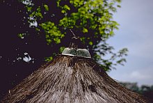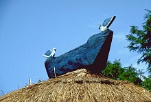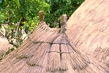 雨のあたる屋根の棟をどう納めるかはそれぞれの土地で工夫のみられるところだが、ロンボック島では、チガヤの代わりに稲藁を束ねて棟をまたぐように重ねる。稲藁が手に入らないときは、稲刈りの時期までチガヤで代用しておくという。チガヤより稲藁のほうが丈夫というのがその理由である。