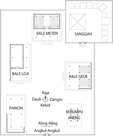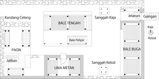 それに対して、バリ・マジャパヒト人は平地に居住するふつうのバリ人のことで、その住まいはバリの家屋としてよく知られる観念にもとづいて建設されている。つまり、ロンタル文書にさだめられた規則にしたがいながら、塀で囲われた屋敷地のなかに、機能のことなる数棟の独立した建物を建てるのである。