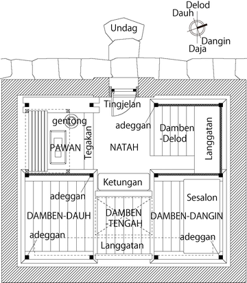 屋内には、土間のままにのこされたナターと、後ろ半分の床をはったダンベンがある。扉の前に残された小さな土間空間をはさんで、(奥からみて)左側に調理場のパワンがある。パウォンは別棟の炊事屋をあらわす言葉としてバリ島じゅうで使われている。トルニャンの住居でも、パワンにはカマドがあり水甕が置かれている。パワンに対面する右側には棚がつくられ、食器や食物の置き場になっている。床をはったダンベンもやはり中央の間をはさんで三分され、(奥からみて)右側を「東のダンベン」、左側を「西のダンベン」という。現実にはむしろ北にちかい「東のダンベン」を「東」と呼ばねばならないのは、つぎのようなトルニャンの方位観のせいである。