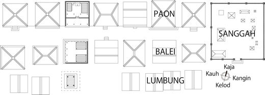 広場に沿ってならんだ住居は、トルニャンのような単棟ではなく、短冊形に地割りされた敷地を塀で囲い、そのなかに複数の建物を建てている。これはテンガナンもまた、バリ・マジャパヒト人の住宅建築の影響をまぬがれなかったことをしめしている。しかしながら、そのなかで母屋にあたるバレ・テンガーは、屋根裏を各家用のコメの収納場所にあてているのである。母屋はこうした穀倉の下に、高さ八〇センチメートルほどの床をはって、生活空間にしている。屋根裏のコメの出し入れは、通常の穀倉のように、屋根の破風に開いた扉をとおしておこなっている。