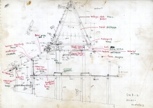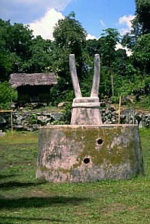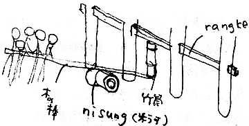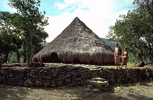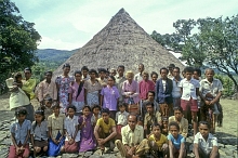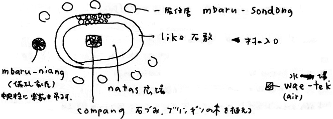 Wunga は丘の中腹にある20棟ちかくの慣習家屋からなる村。村の敷地自体、珊瑚岩が荒い地肌をみせていて、村の建設にふさわしい土地とはいえない。西スンバでは壮麗なドルメン群も、ここでは平滑な岩が入手しにくいためか、このゴツゴツの珊瑚岩を切り出したもので、レリーフは不可能だ。いくつかの古い遺物が残るけれども、この土地の気風も同じで仕上げはきわめて粗い。竹以外に建物に適当な木が近くで得られないこともあって、主柱を除いては頻繁に改修を繰り返してきたものとおもわれる。このなかから、Waimolu という一棟を選んで実測に決定。ラジャ所有の Prain 家も古いが、家屋横にバレ(付属屋)のつく特異な形式。あきらかな後年の追加だが、これもアダットで古い形式に従っているだけと言われれば返す言葉はない。アダットもつぎつぎ塗り替えられる。最近は外国人に金を要求するアダットが多い。