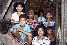 村人がかならず村にいるわけでもないのに、数日しか時間のない観光客がこのアダット会議を待つなどという現実離れした取り決めに従えるはずがない。もちろん、こんな取り決めは市役所側が PdK の修復観光化策をのませるためにしたカラ手形だろう。ともかく、非は連絡をおこたった市役所と村長と大統領にあるというすり替え策が功を奏して、彼の(戦争を司るアダット長から将軍になっていた)怒りもおさまり、この家でめでたく昼食をご馳走になった。