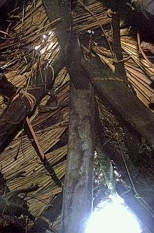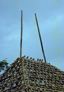 住居の建設は主柱→梁・小梁→外周柱→もや→真束→4本の垂木(垂木同士を結ぶ)→他のもや→他の垂木→屋根の小舞(チガヤを受ける横桟)の順におこなわれ、建設後に中央の真束を取り除くものがあるという。