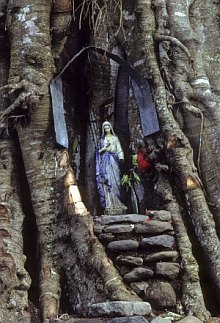 ロンボックの木彫はみな愛嬌のある顔をしている。ワヤン・ゴレッに登場するボケ役のキャラクターだ。首が長く肩が落ち、間の抜けた顔でとぼけたことを言い、周囲を笑わす。と、思ってベモに乗って周囲の人びとを見ると、この木彫にそっくりな顔が多いことに気付く。目と目の間が極端に離れ、顔の輪郭にしまりがない。これがロンボックに独特の木訥、明るい農村的雰囲気を醸し出しているのかも知れない。