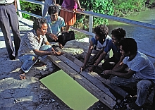 村長宅まで行くために大きな川を渡る。靴をぬぐと針の山を歩くような案配だ。ここの村長宅の板床の上にティカールを敷き、よく煮え切らない砂利のようなご飯を食べる。Wunga での実測後、マンディもしていない身体でもう一泊する。まるで兵隊だ。蚊がかまびすしく飛び交っている。
