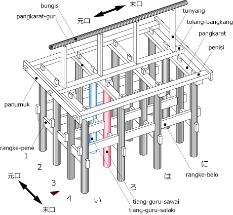 家屋はロティ島とおなじで棟を東西に向けるから棟持柱にこの方位名称はつかない。ところが、ティモール島の Belu に行くと、テトゥン語で家屋前方の棟持柱は lor(テトゥン語で lor には意味がない。ただし、北部Beluの Bunak では海を意味する)、後方の棟持柱は rae(rae は大地)と呼ばれている。