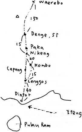 スンバでは荷物を背負って山歩きをすることはもうあるまい、と考えていたのにまた歩く。クパンで買った12,000RPの靴は底が半分剥げてヒタヒタ音をたてる。これをボンドでくっつけ、バンドンまでもってください、と念じながら再び歩く。