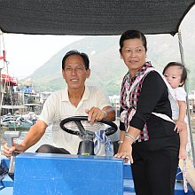 大澳に生まれ、家船でそだつ。27歳のときに、都市近郊漁民の娘だった現在の妻(61)と結婚。男4人、女1人の子がいる。20年ほどまえに公共住宅が建ち、子どもたちはそこで暮らす。アパートの家賃は月1000~2000香港ドル。しかし、夫婦は末子家族と一緒に船住まい。仕事中も孫の子守をしていた。