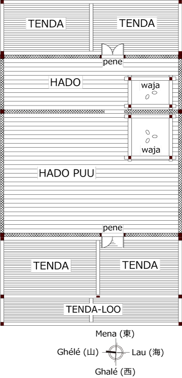 家屋は東西に棟を向けた妻入り。妻側にベランダ tenda がとりつき、竪板壁で囲われた屋内へはベランダにひらいた扉を通してはいる。屋内は間仕切壁を境に前後の2室 hado にわかれている。それぞれの部屋には、川下(南)側の壁面に接して炉の設備がある。上座である川上(北)側に座り、炉に向かって右手(調査家屋では西側)にある部屋 hado puu (主室) が左の部屋より大きく、主人夫婦の寝所にあたる。また、間仕切壁の上座側に立つ壁柱 wisu puu は儀礼の対象となる心柱にあたる。