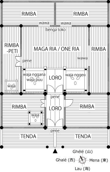 竪板壁で囲われた人間の生活空間、そして神に捧げられた巨大な屋根裏空間の全体を平石に載った床束 leke が支えている。床束には太い丸木のほか立石が利用される。また、家屋の中心とされる平石 watu koe lewu (床下に埋める石)/ watu puse (臍の石)が床下 lewu に据えられている。