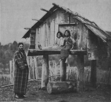 穀倉型住居の特徴でもあるこうした高床(屋根裏)部分の象徴性をしめす例はニュージーランドのマオリ族にもある。