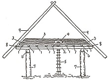 オセアニアは一般に地床住居の分布地帯であり、棟持柱や真束を利用して屋根の棟木を支持する構造の建物が広範囲にみられる。しかし、ポリネシアのラカハンガ島に残るふるい形式の住居では、こうした構造によらずに、四本柱の軸組にのる合掌材によって棟木をささえている。合掌のかたちづくる屋根裏空間は寝室やココヤシの実などの倉庫につかわれるほか、氏族の神をまつる家ではここに首長の遺骸がならべられていた。(*9)