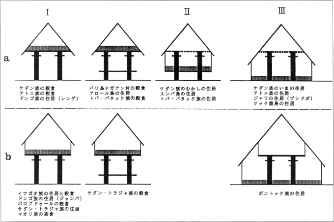 たとえば、イフガオ族はⅠ、スンバ島の住居やケダン族のむかしの住居形式はⅡ、ボントック族の住居やケダン族の現在の住居形式はⅢという具合である。
