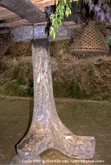 穀倉の建築を住まいに転用する一番簡単な方法は、穀倉にそのまま住んでしまうことである。ルソン島の北部山地民のあいだでは、実際にそういう現象がおきていて、イフガオ族の家屋と穀倉はおなじ構造で建てられている。その構造は高床建築のプロトタイプのひとつと言いうるもので、竪板をはぎ合わせてつくった箱を4本の柱で支えていると考えればわかりやすい。屋根を度外視すれば、屋内に柱がなくてもこれで自立する。組み立て解体も自由にできる。こうして安定した壁面構造があるおかげで、それを支える下部構造の自由度も高いのである。実際に、イフガオではしばしば掘立柱のかわりに根付きの木の幹を柱に利用している (図⑳) 。