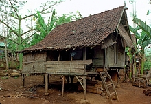 たとえば、プランバナンのチャンディ・ヴィシュヌにあるレリーフ (図①) では、平側に一段さがった下屋をもつ高床建築が描かれている。住居のこうした下屋部分は、一般にマレー語でスランビ(前室、前庭)と呼ばれる庇空間で、イスラム教の影響がつよくおよんだマレーシアやインドネシアの一部では現在も普遍的にみられる家屋形式である (図②③) 。また、屋根の妻部が外に転んでいるのは、この地域の基層文化ともいえる舟形屋根の証拠として、これも記憶すべき重要な点である。