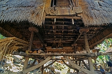 巨石文化というと、かならず名前がでてくるのはニアス島で、巨石記念物はもとより、集落全体が石敷きで覆いつくされたまさに巨石の島。この島の家屋の様式的な進化はすさまじいばかりだが、基本はイフガオ族の家屋と変わらない。肥大化した上部構造を支えるために、筋交いの柱を利用している (図㉒) 。