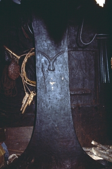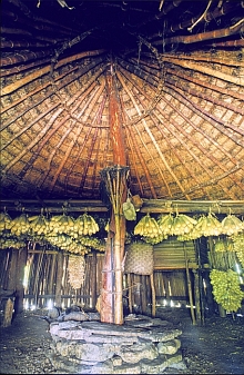 このウメ・レウの中心には円形に築いた石積みの祭壇がある。祖霊を象徴するといわれる神聖な中心柱ニ・アイナフ(母柱)がその上に建ち、たいていガラクタのような無数の器物がそこにとりついている (図⑬) 。これらはすべて祖先ののこした神聖な遺品の類で、剣、槍、火打銃、ゴングなどから、シリー入れ、薬草などの携帯品、戦いの際に頭に巻く赤い布などにまじって、収穫祭の名残りのトーモロコシの初穂まである。かつて村落同士の戦いが頻繁におこなわれていたときには、出陣前に男たちはこの建物であつまり、戦勝を祈願したという。ウメ・レウが戦闘の家ともよばれるゆえんである。もっとも、アトニでは氏族単位にこうした儀礼用の家屋を所有しており、収穫祭など祖先にかかわる儀式はみなここでおこなった。