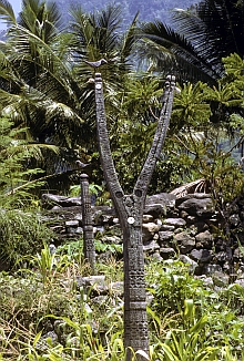 東南アジアにみられる巨石文化について論じたハイネ=ゲルデルンによると、その文化複合の特徴として、ドルメン(支石墓)やメンヒル(立石)、巨石広場などの巨石建造物 (図⑥) とならんで、棚田耕作やY字型の記念柱など巨石と無関係の要素まであげている。こうした記念柱はアッサムやベトナムの山地民をはじめとして東南アジアではひろくみられるが、その建設には盛大な勲功祭宴をともない、勇者として建設者の名を記憶にとどめたのだという。(図⑦) 。