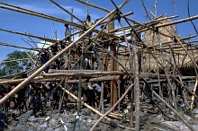 石積みの基壇に建つミクロネシア、ヤップ島の集会所フェバイでは、棟木だけでなく屋根のモヤまで独立の柱で支えている (図㉕) 。柱に複数の機能を受けもたせることをせず、支持が必要な部材はともかく地上から柱を建てて支えてしまう。こうした建築観をもった人たちが、高床構造を受け入れると、ニューギニアのセピック河流域でみられる精霊の家ハウス・タンバランのように、屋根と床の構造をきりわけた建物が生まれるのではないだろうか (図㉖) 。精霊の家では、そうして必要になった無数の柱にことごとくセピック特有の精霊像が刻まれている。こうなると、現実に家の建設は棟持柱を建て、屋根構造を組み上げることからはじめるより仕方なくなってしまう。これについては、ティモール島におもしろい事例がある。
